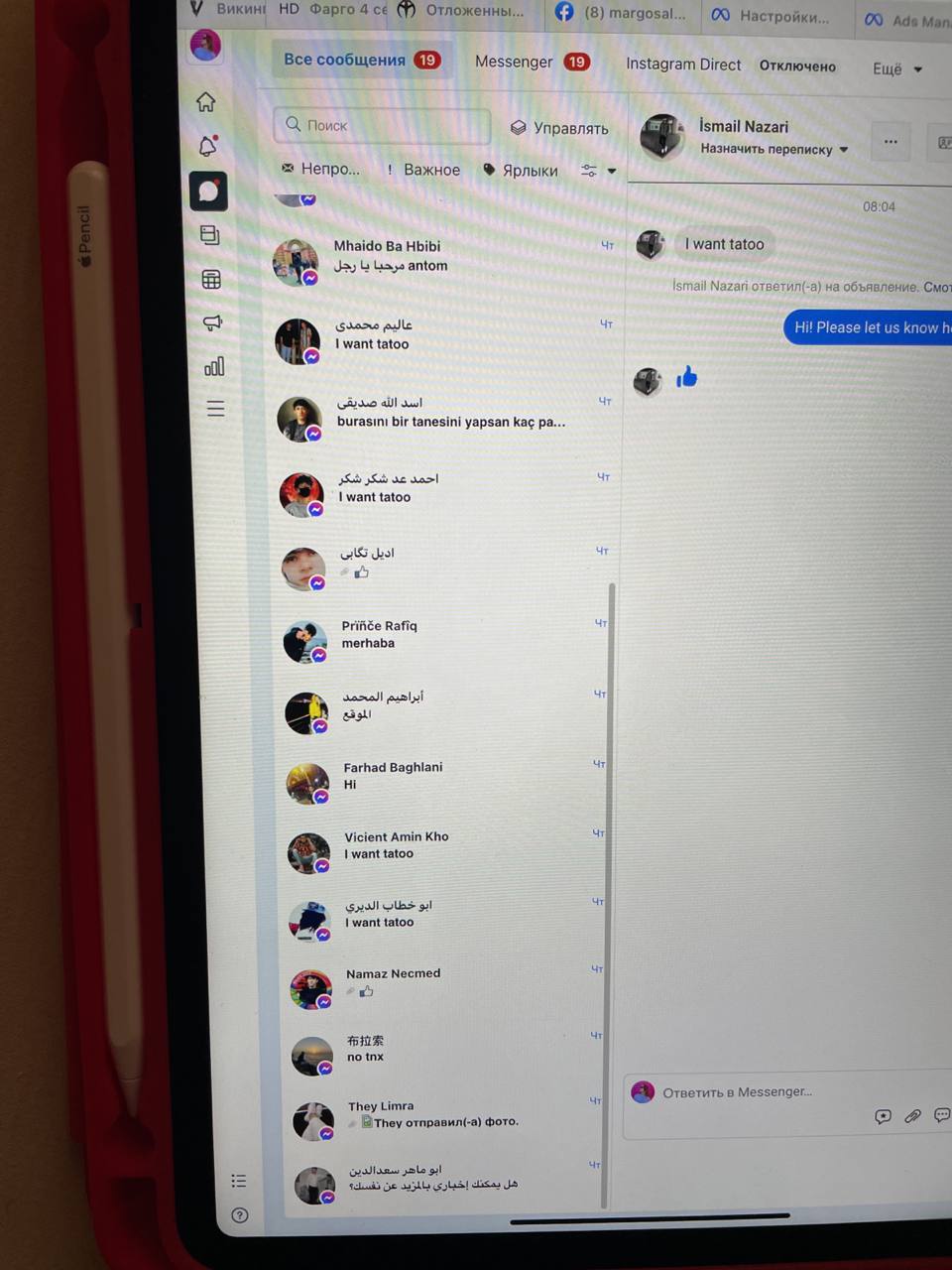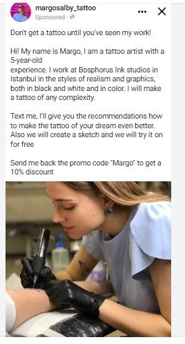 Трафик вели на сообщения в инстаграм и фейсбук с простым “входом”: всё что нужно сделать клиенту - нажать кнопочку “Хочу тату” и начать переписку с мастером.