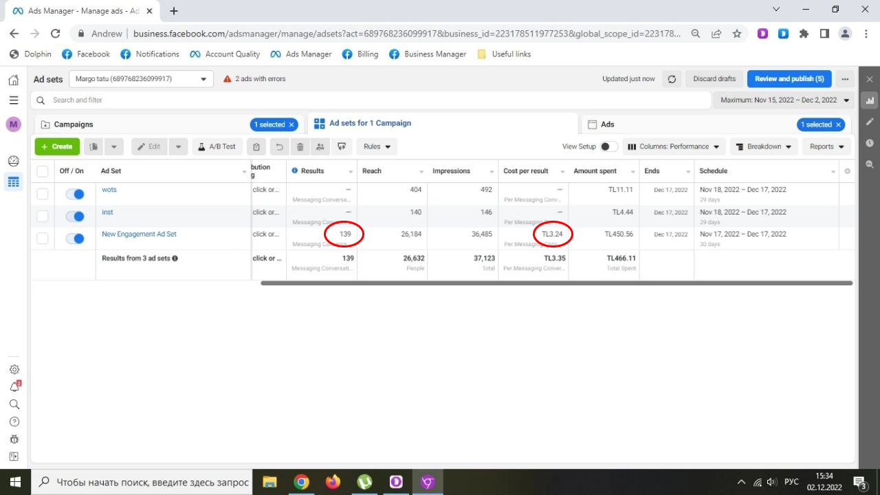 Получили 139 сообщений по 3,34 лир за 3 дня работы кампаний.