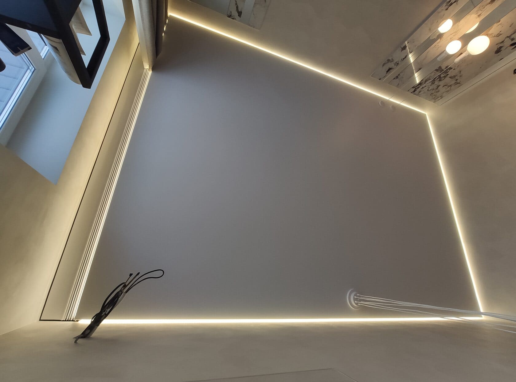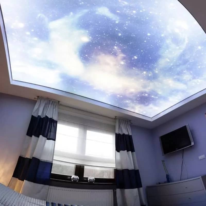 Ткань способна дышать, потому такой потолок не станет препятствием для движения воздуха между основным потолком, натяжной конструкцией и помещением.